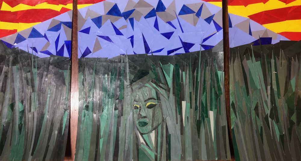 German Amaya, The Grass Bitch, 2019, individually painted paper, cut and glued, in triptych layout, 7.5″ x 36″