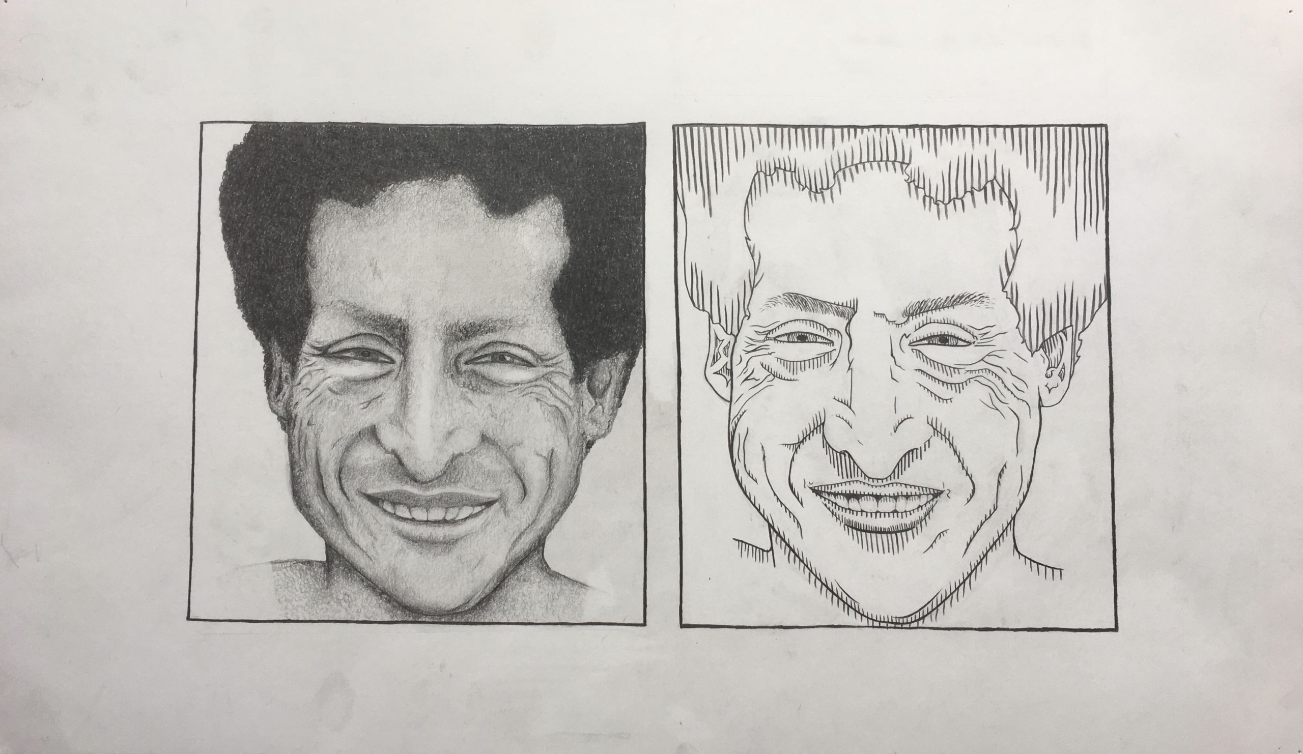 This drawing was inspired by the prompt of "quilts." After doing some research on the multicultural significance of quilts and quilting, I realized that what all quilting traditions had in common was a sense of honoring/remembering something/someone significant, in order to preserve a memory. This is a portrait of my grandfather whom died when I was very young, but is still a very prominent figure in my family history. This drawing represents the dichotomy of the fragmented memories that I have of him, next to the idea of him that exists within stories that I have been told. They are not necessarily contrasting, but somehow separate.