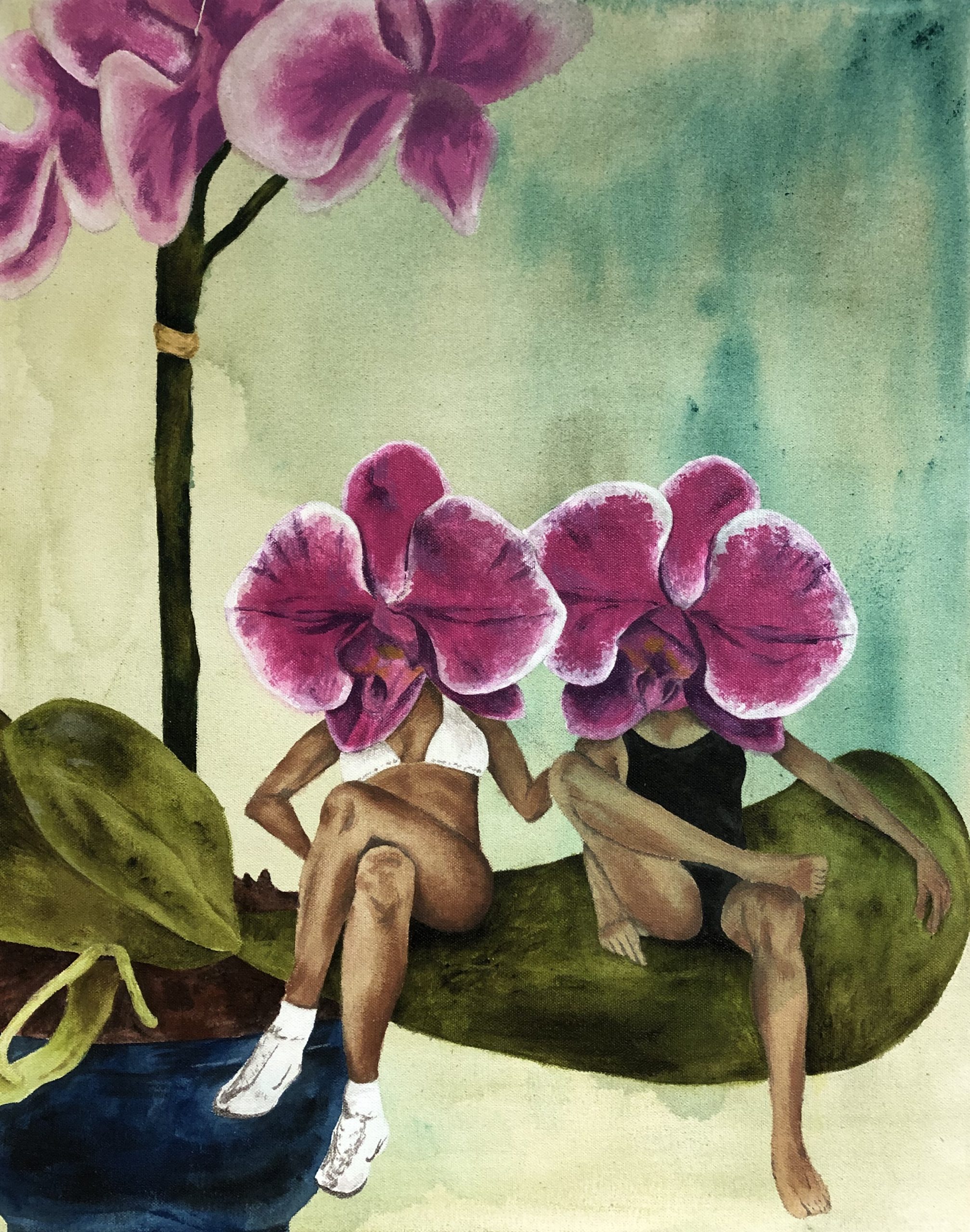 The theme of this painting was to juxtapose realism and surrealism. These subjects represent my sister and I playfully mocking my mother’s love for orchids. For as long as I can remember, my mom has always had at least one orchid in the house. She currently has the entire window sill of her dining room filled with them. I was always impressed with her care for them since I know they are temperamental, much like her own personality.