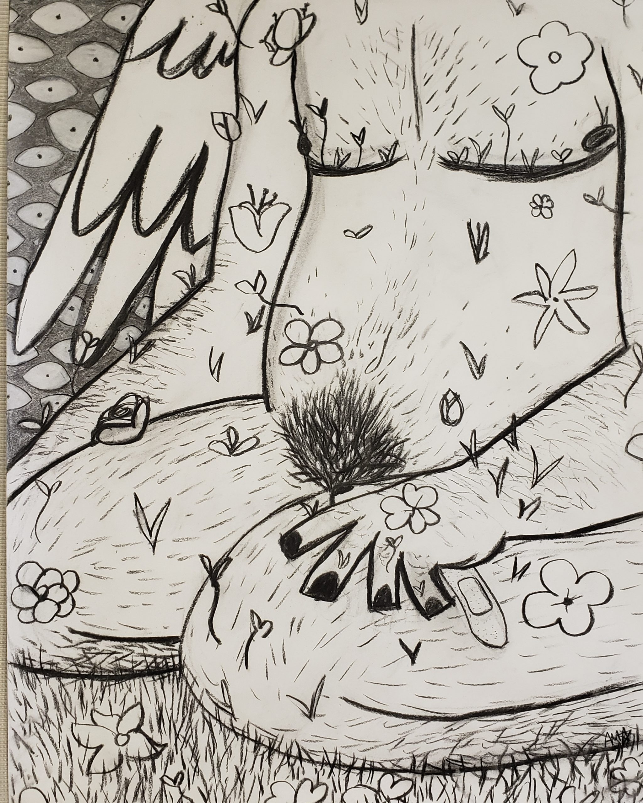 August Mollet, loving the self is a difficult journey, 2020, charcoal, conte on paper, 24″ x 18″