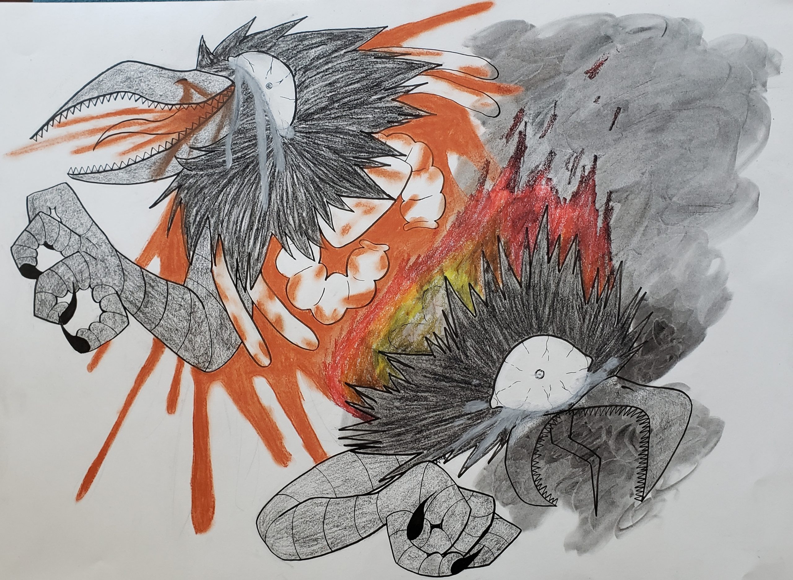 August Mollet, YOU LOVE THE PAIN UNTIL YOU BURN OUT, 2020, ink pen, charcoal, crayons, conte on paper, 18″ x 24″