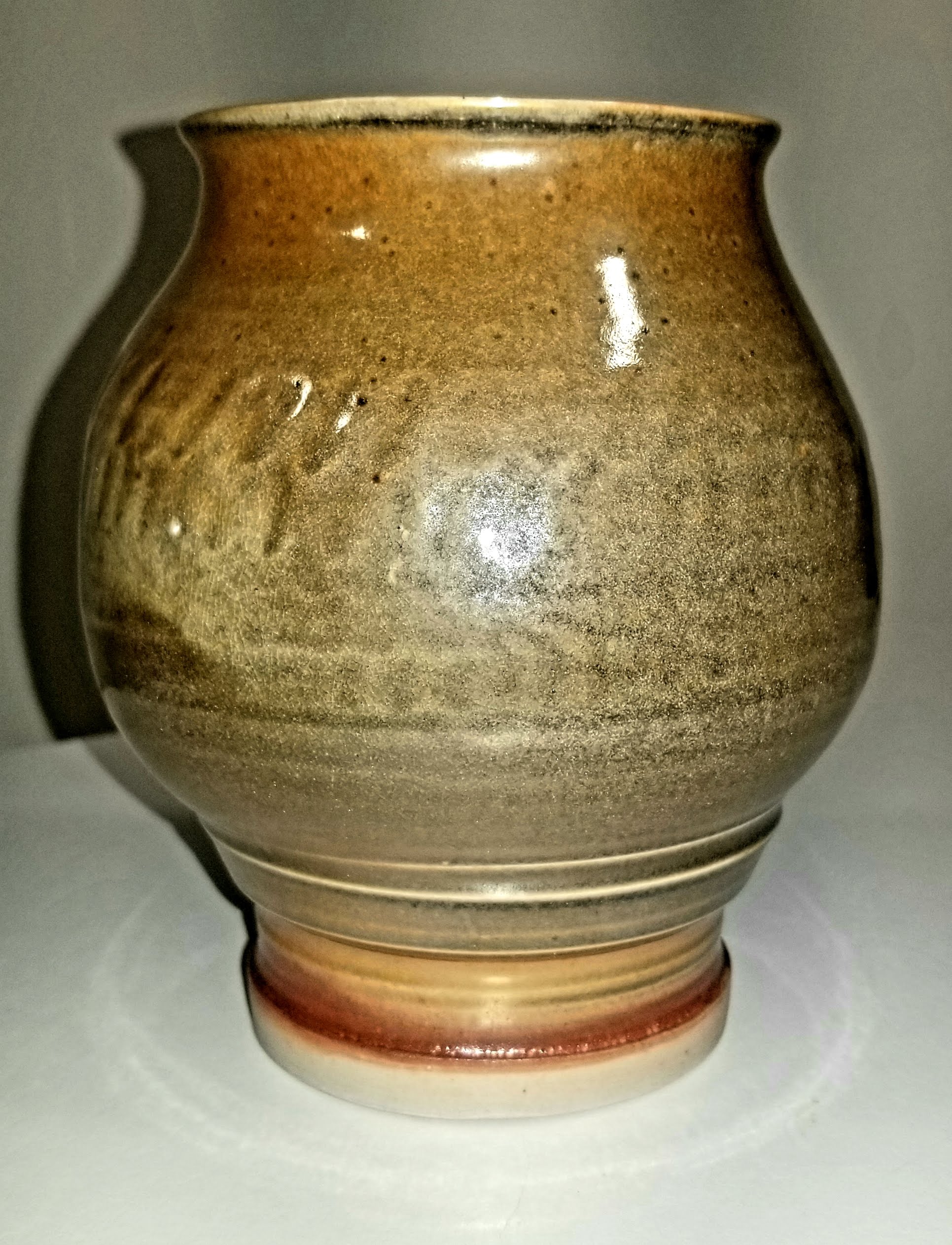 This is a classically shaped vase, thrown as a cylinder then shaped. The foot and final shape are refined through trimming. The pattern of variegation in the coloring is created by chattering the vase while trimming. The entire vase is glazed in MD shino and fired at cone 10.