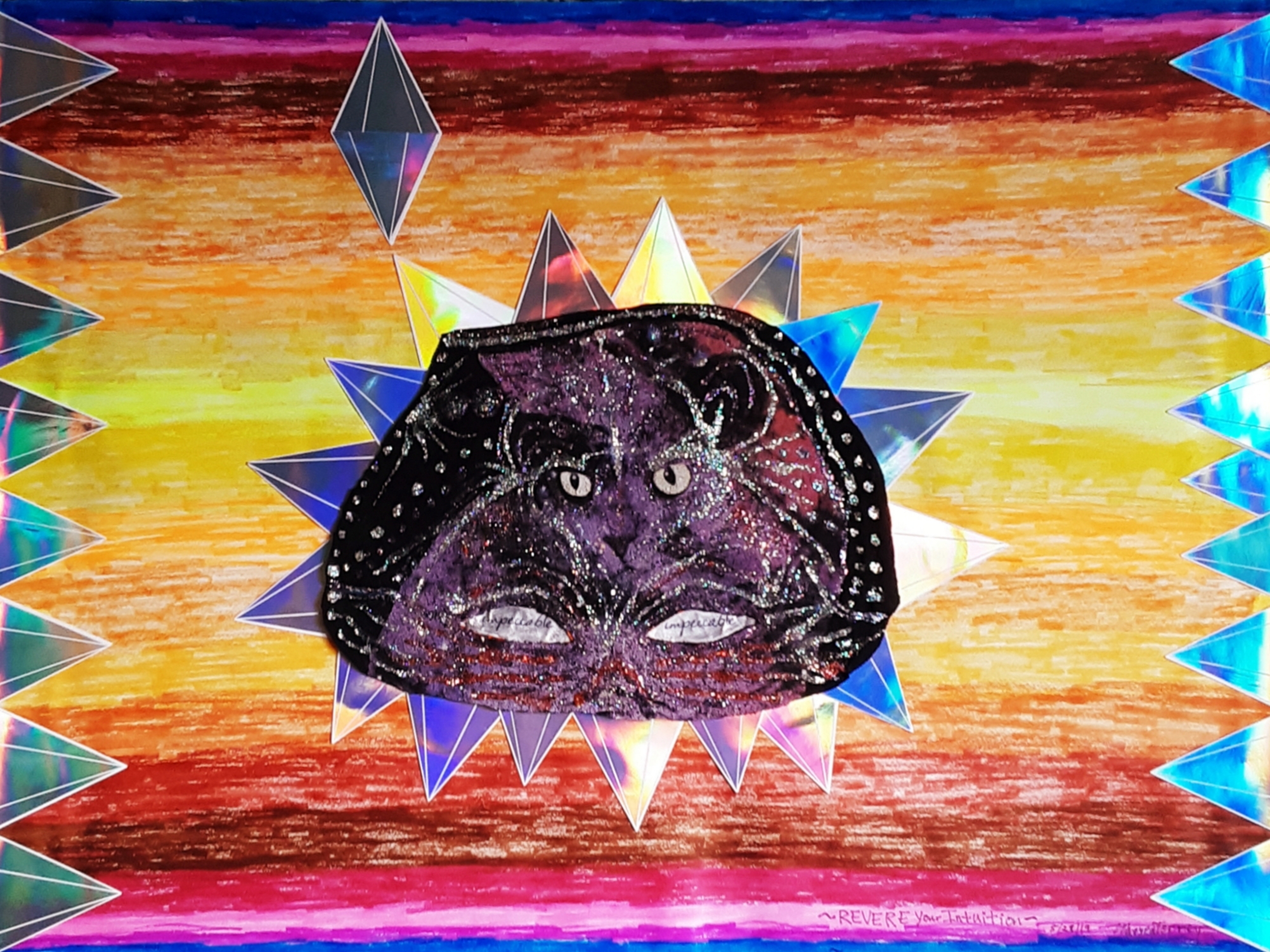 Maryea Torrey, Revere Your Intuition!, 2019, collage, ink, cloth, foil, assemblage, holographic paper materials, 18″ x 24″