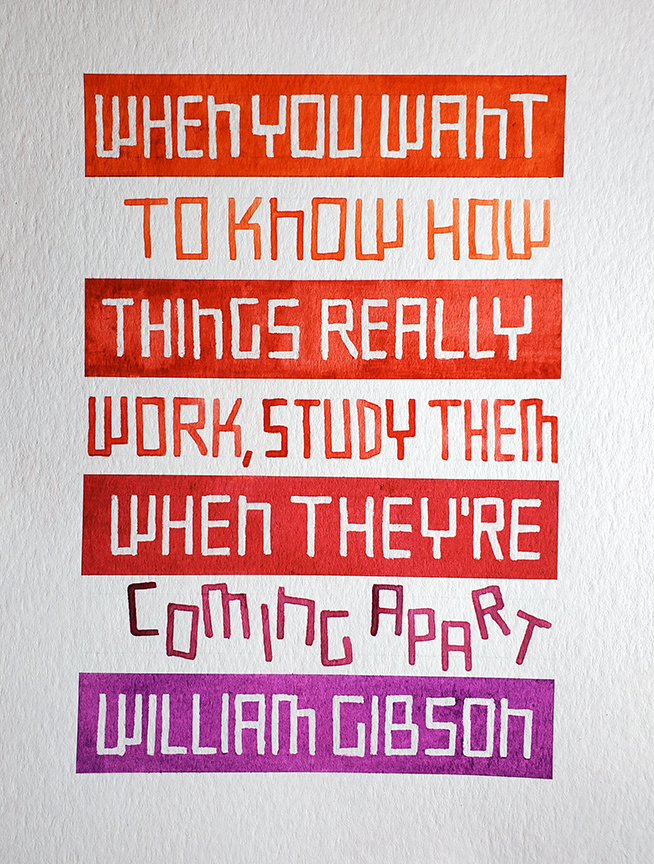 This project was hand lettered using a dip pen, masking fluid, and watercolor in a style called Robot Lettering. I chose a quote by William Gibson and explored color, positive and negative space, and movement.