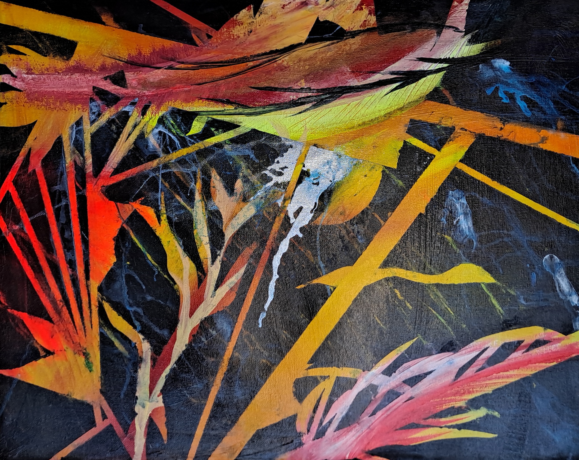 This piece is typical of my personal style. It combines pouring and painting to create abstract shapes and forms.