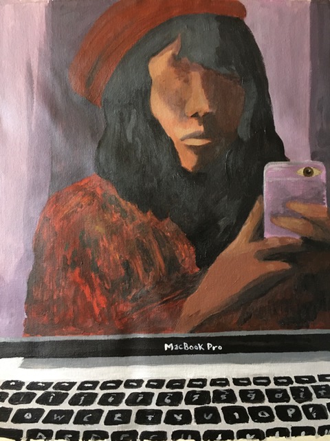 This painting was created using acrylic paints. The assignment instructions were to use different types of painting techniques we learned in class to create a cohesive image. Among the methods used are short choppy brush strokes, and flat colored areas. The image is meant to convey how we have utilized the Internet during the pandemic to continue to be a part of the world. The Internet being our eyes, so to speak.