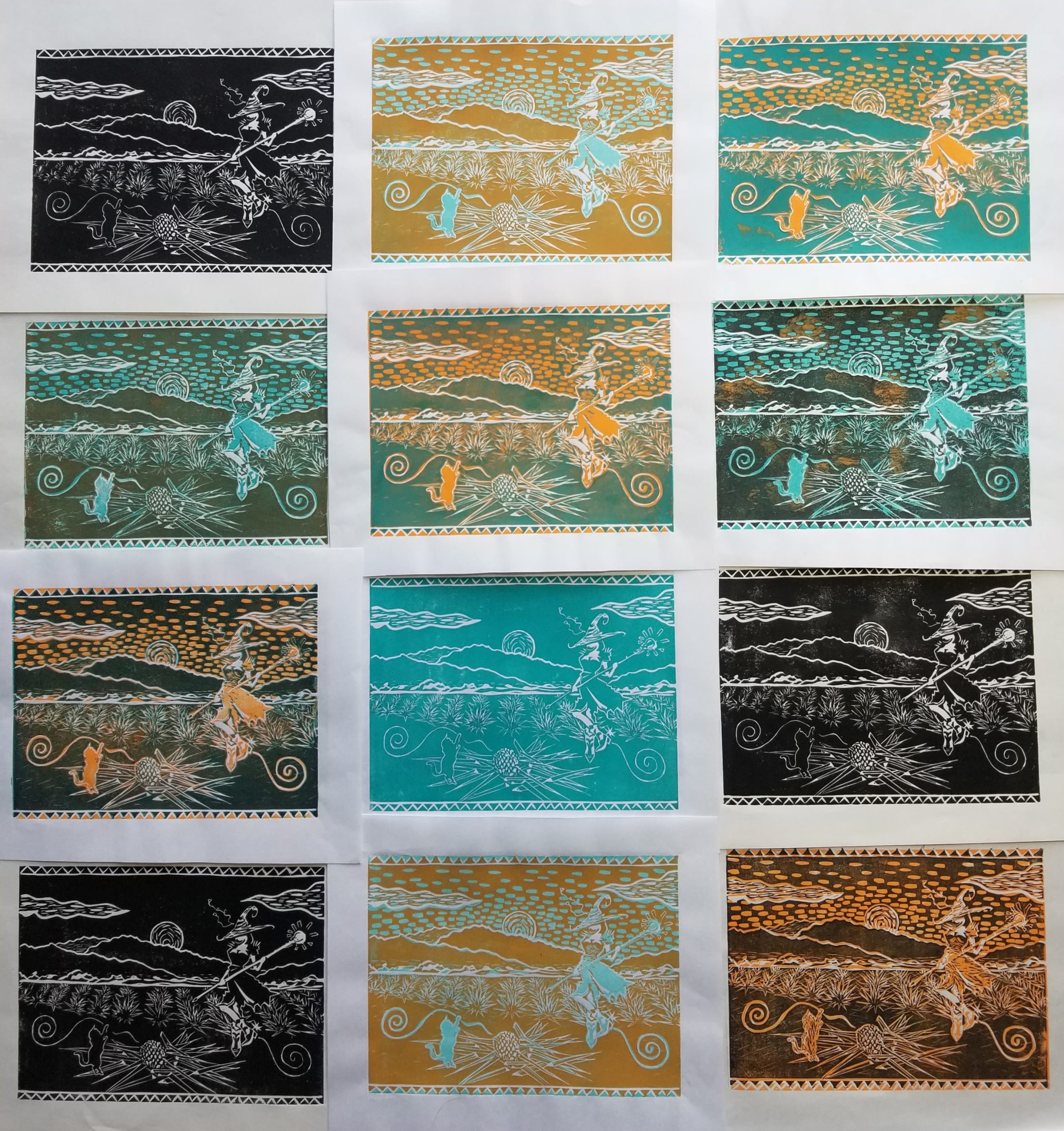 This set of block prints was inspired by a trip in Mexico and the friendly interactions I had with mezcaleros who shared their trade and traded stories over carved gourd sipping cups of their “nectar of the gods.” The witch represents the magic these agave farmers invoke through hard work in hot, arid fields, much of which is carried by their joyous spirit. This was a first time attempt at this new art form and process. Only two complimentary colors, plus black and white ink were allowed. I fell in love. It was an intoxicating experience.