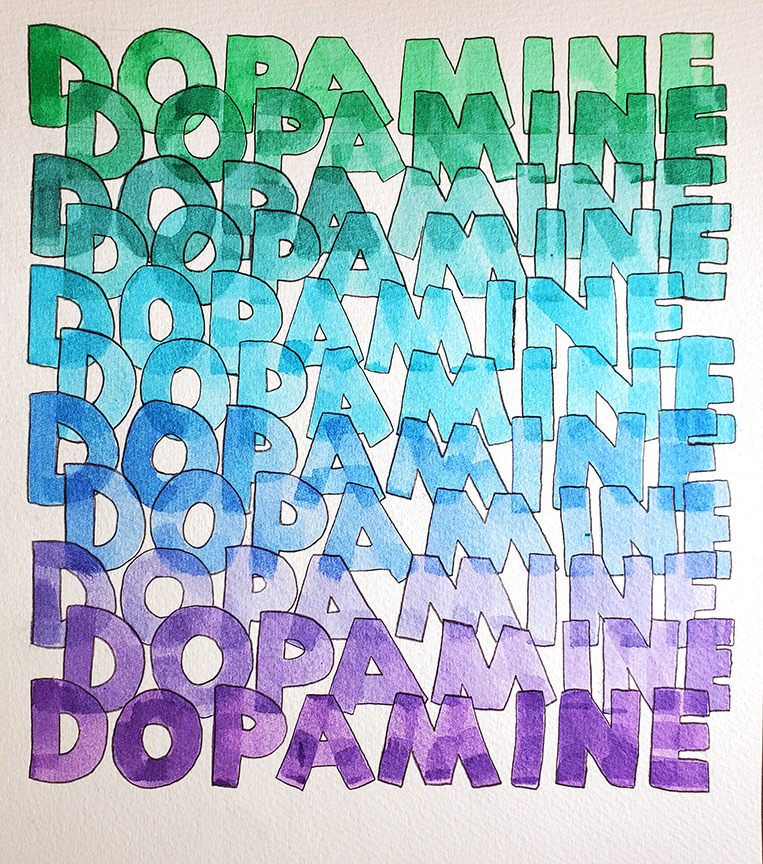 This lettering project uses a style called Neuland Brush and explores repetition, color change, and depth. I chose the word "dopamine" because it is the neurochemical responsible for reward feelings, which is one of the major reasons I create art.