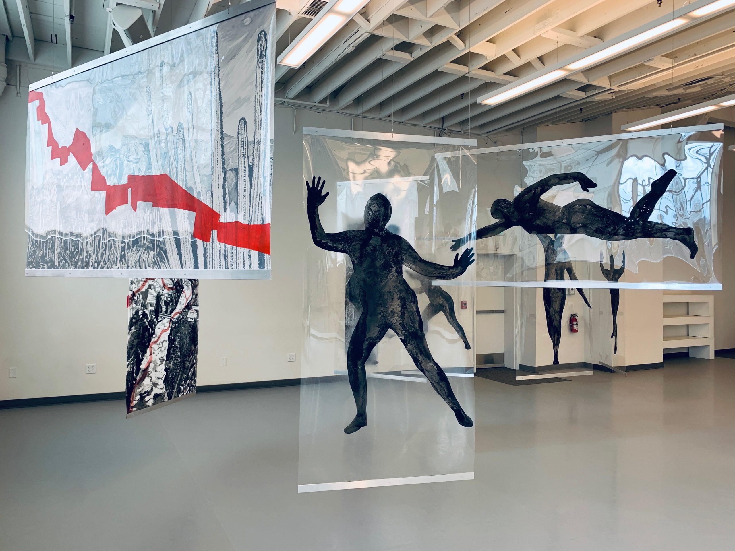 Sabina Haque, Detail of (UN)Belonging, installation at NW Dance Project, Portland, OR, January-February 2021, ink drawings on DuraLar and Mylar transparencies, 15 drawings, each 7' x 3' or 3' x 7'. Photographs by Ian Lucero.