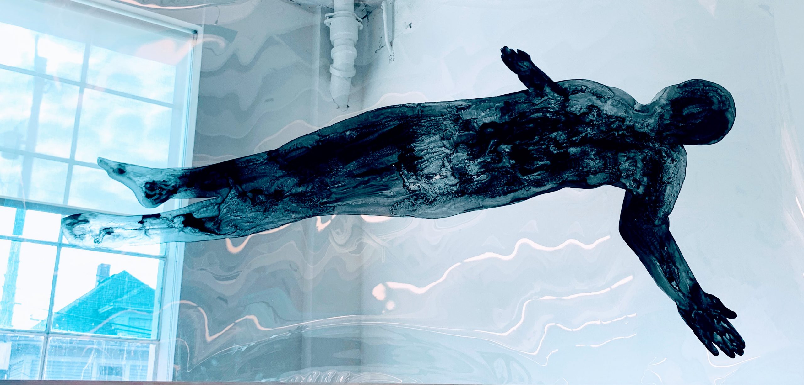 Sabina Haque, Detail of (UN)Belonging, installation at NW Dance Project, Portland, OR, January-February 2021, ink drawings on DuraLar and Mylar transparencies, 15 drawings, each 7' x 3' or 3' x 7'. Photographs by Ian Lucero.