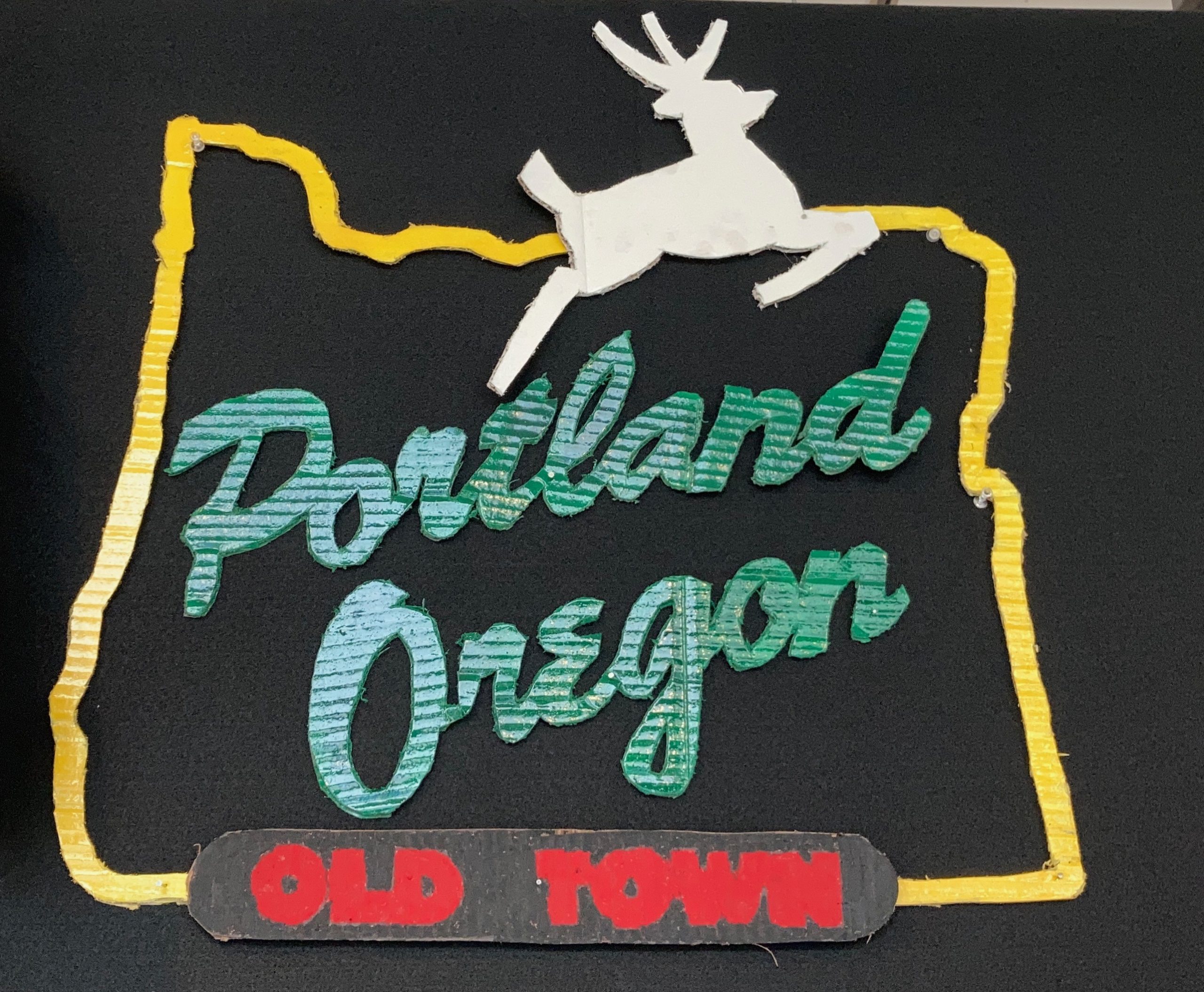Detail of "Our Town, Old Town: Placemaking in Portland, Oregon" pop-up window exhibition, 2023, mixed media installation, approximately 8' x 10' x 1.5'.