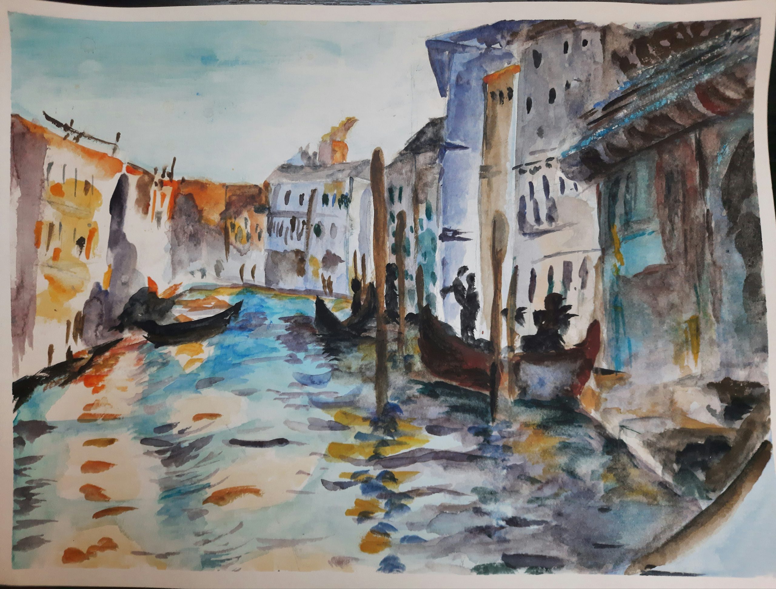 The painting pictures a floating sky whale and a small child-like figure towards the foreground. It is created using watercolor and is given a loose and transparent feeling. Nature and destruction were some themes that I kept in mind when working on this piece. The red background is meant to represent fire and give an ominous feeling. It aligned with some of the events taking place at the time such as the wildfires. The whale, while non-threatening at first, becomes more foreboding as the scene is taken.