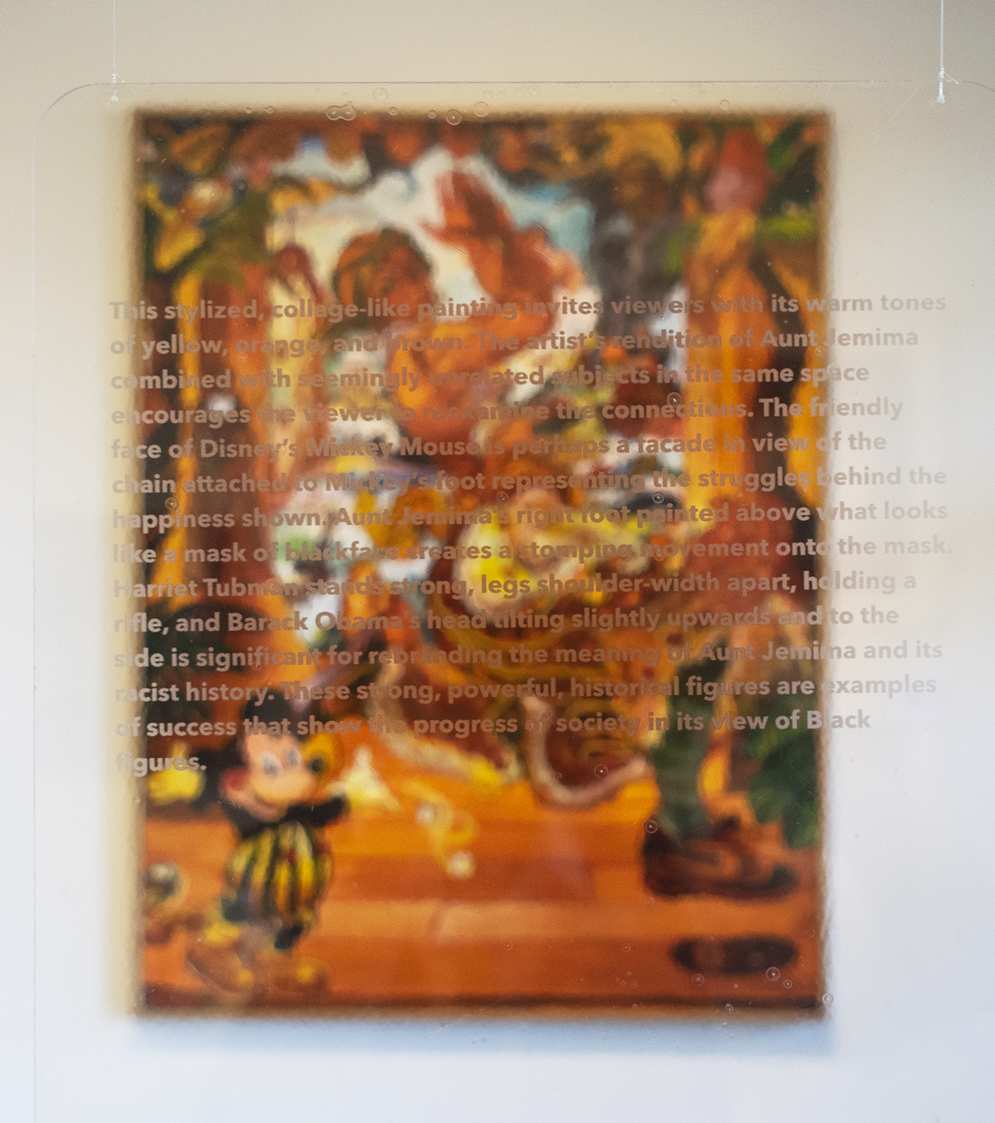 A representational painting of a schoolyard basketball court is hanging on a wall in the background. In the foreground is text describing the painting, printed on a clear acrylic panel which is placed directly in front of it.