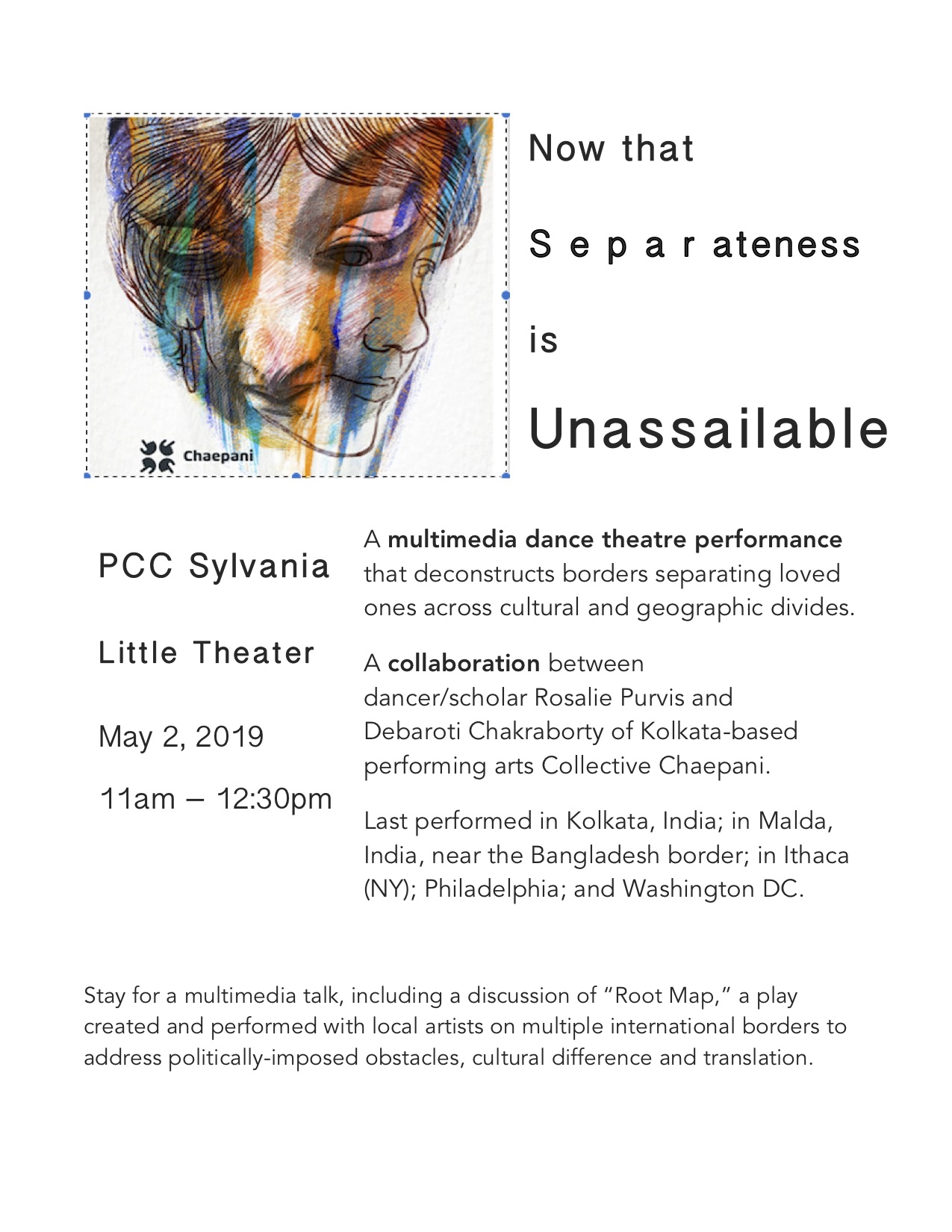 Performance and Talk: May 2, 11am-12:30pm, Little Theater “Now that Separateness is Unassailable” A 30-minute multimedia dance theatre performance (followed by a talk) that deconstructs the borders that separate loved ones. In their desperate longing to breach the cultural and geographic separations that divide them, two women from opposite ends of the globe bend time with the warmth of love they share. “Now that Separateness is Unassailable” is a collaboration between dancer/scholar Rosalie Purvis and Debarati Chakraborty of the Kolkata based performing arts Collective Chaepani. The two will discuss past collaborative projects including “Root Map,” a play created and performed with local artists on multiple international borders, addressing and crossing politically imposed obstacles.