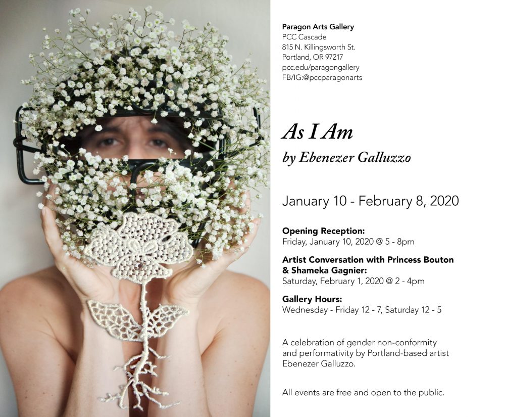 Paragon Arts Gallery at PCC Cascade presents As I Am by Ebenezer Galluzzo. Please join us for an opening reception on Friday, January 10, 2020 from 5 – 8 pm, with an artist talk at 6 pm. Public programming continues with an artist conversation featuring Ebenezer Galluzzo, Princess Bouton and Shameka Gagnier, with films by Princess Bouton and sculpture by Shameka Gagnier on Saturday, February 1, 2020 from 2 – 4pm. All events are free and open to the public.