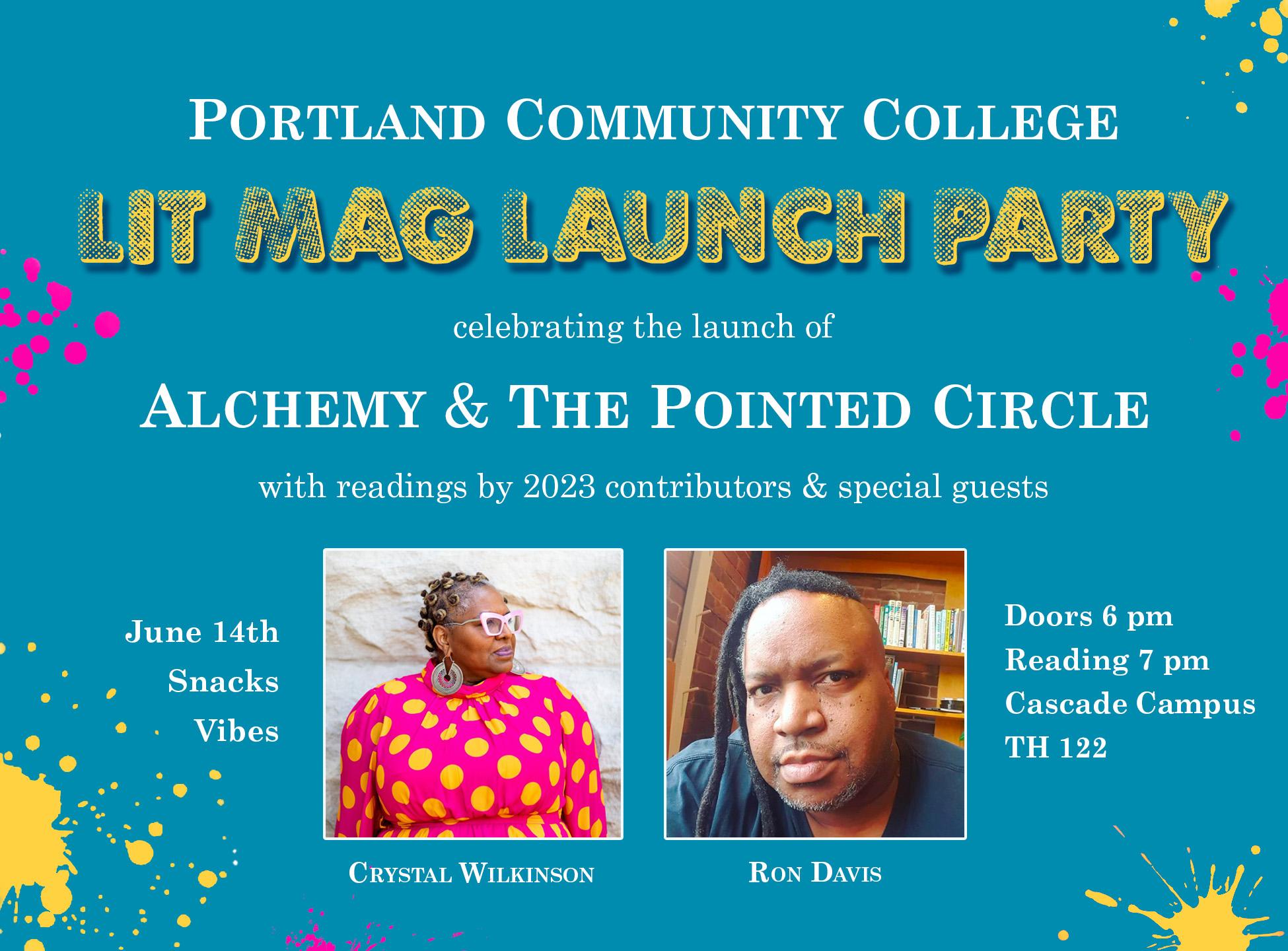 Join us on Wednesday June 14th at 7 pm for the launch of two of PCC’s literary magazines, Alchemy and The Pointed Circle. Doors will open at 6 pm in Terrell Hall 122 on the Cascade Campus, and then at 7 pm we will hear from the editors and contributing authors of this year’s issues of the two magazines. To end the night, we’ll have short readings from award-winning writers Crystal Wilkinson and Ron Davis, aka upfromsumdirt.