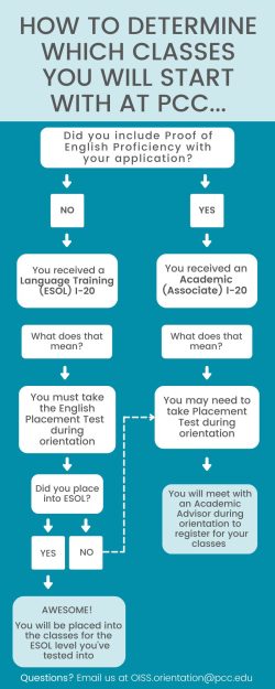 - Orientation week includes placement testing, academic advising, and class registration. These mandatory activities cannot be rescheduled in time to begin the term. Student who miss orientation cannot begin at PCC until the next term and will need to defer to a future term or attend another school if they are already in the U.S.