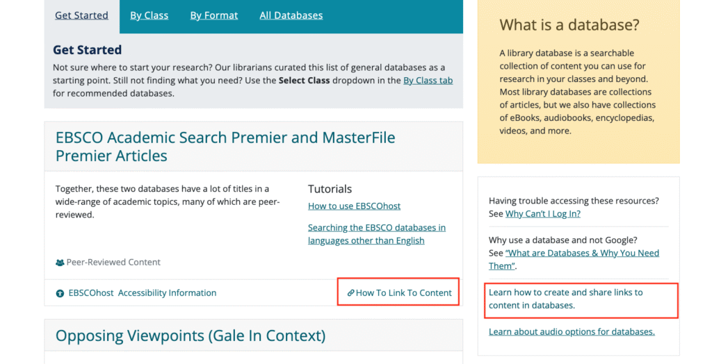 “Learn how to create and share links to content in databases” link on the right-hand side of our Articles & Databases page