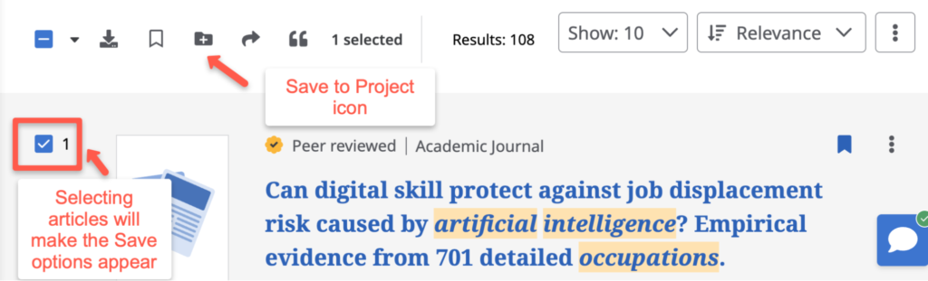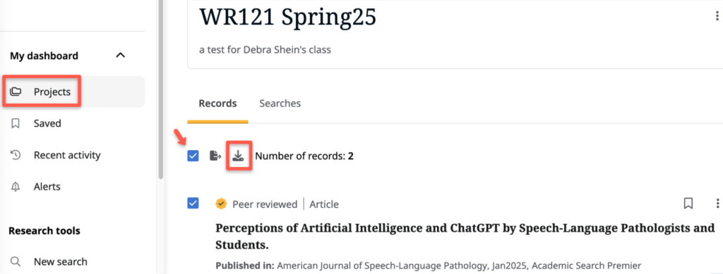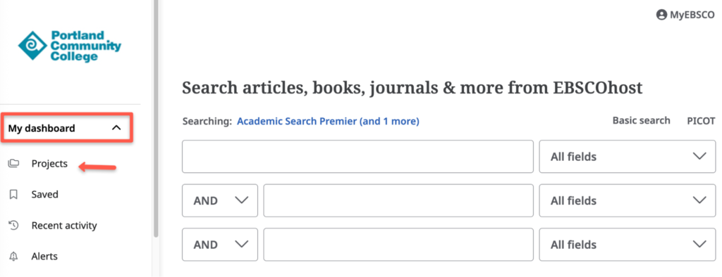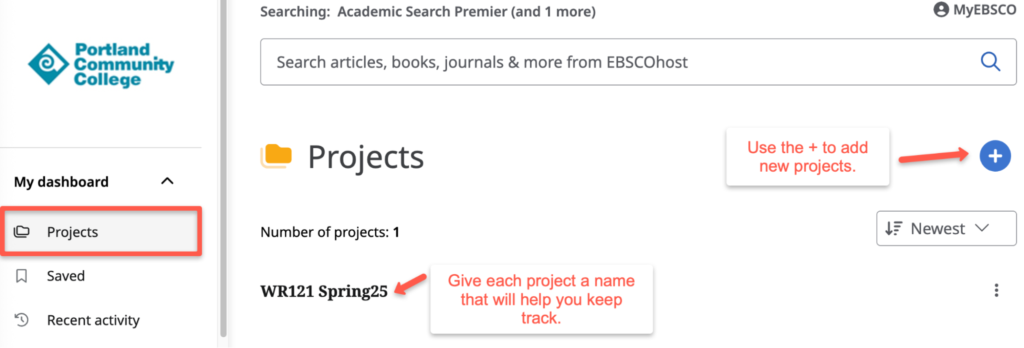 Getting Started Start from library home page. From the homepage, you have two options: Use the “Articles” tab in the Library search box to search MasterFile Premier and Academic Search Premier. Or click Databases under Shortcuts to find EBSCOhost databases. EBSCO Academic Search Premier and MasterFile Premier Articles is the first database listed under “Get Started”. Or select All Databases, select “E” and scroll down to EBSCOhost. Select the database(s) you want to search, then click Continue. EBSCOhost Choices When you access EBSCOhost from the All Databases link, all items will be checked, you can see this by clicking on the “Choose Databases” link above the search box. PCC Library has 37 EBSCO databases that are listed. The other EBSCO databases have more or different information, and are listed individually in the “All Databases” list on the PCC Library Articles and Databases page with a description of what subjects and types of information are available. Starting Your Research After you have selected EBSCOhost, it will take you to the search page. At the top will be a search box to enter keywords related to your research topic. Below the search box are several ways you can filter your search before you begin. Full text is already selected for you. You can filter results to Scholarly (Peer Reviewed Articles), publication date, or by the title of a specific publication. If you are not sure how you want to filter your results at first, you will find these and other filters on the list of results (see the Refine Results section.) Evaluating Results Your search results will appear as a list of articles from different source types, such as magazines, academic journals, news, and so on. Search Result Anatomy Title Each search result starts with the title of the article appearing in blue and hyperlinked at the top. Clicking the title takes you to the detailed record of the article, which includes information about the article and tools for saving and sharing it. Publication Information Beneath the title is the name of the author (or authors) of the article, the title of the publication it appeared in and the date of publication. Abstract After the publication information comes the abstract. The first sentence or so is shown with the option to “Show more” to see the full abstract. The abstract summarizes the content of the article. For scholarly articles, the abstract often explains the research question, methods, and conclusion. Subjects Below the abstract is a list of subjects the article is relevant to. Peer Review and Article Type Identifiers Above the title of each search result will be an indication of what kind of article it is. The most common types are periodical (magazine or trade/professional journal article), academic journal (scholarly journal article), or news (newspaper article). If the article is peer reviewed, that will also be indicated. After the subject headings, there will be a box that says “Access now PDF” or “Access options” with a pulldown menu that shows PDF, online full text, or “Find it @PCC” to indicate how you can access the item. If you see “Find It @ PCC” under the “Access options” pulldown, this indicates the full text is not in the EBSCO databases. Click on “Find it @ PCC” to find full text through another library database or to request through Interlibrary Loan (ILL). Refining Results On the results page under the search box are filters you can use to refine your results. You can filter by Peer Review, Date Range, or Source Type. To change the date range of articles, use the “All time” dropdown to select Past 12 months, Past 5 years, or Past 10 years. Or click on “advanced search” to put in a specific date range. Search Tips Put quotes around phrases to indicate you want the words searched in that order, for example: “gender identity”. Use truncation (*) to get multiple endings of a root word, for example: teen* = teen, teens, teenagers. Use the term OR to combine synonyms to broaden a search, for example: teen* OR “young adult”. You can remove the “Full text” filter to expand your search. If you find an article you want that says “Find It @ PCC” in the “Access options” pulldown, click “Find it @ PCC” to see if it’s available in another database or to make an interlibrary loan (ILL) request. ILL articles are free and usually are delivered in three days. Saving Your Research without a MyEBSCO account Click on the article title to see the options for sharing on the right side of the screen in the Tools icon list. This list includes the very handy cite (quote marks), share (curved arrow), and download (arrow pointing down) tools. You can email an article to yourself from the “Share” tools area. Some other options for sharing (located in the “share” tab) include Google Drive, OneDrive, or Create link. If saved full text appears as HTML code in Google Drive When you open your saved full text or detailed record in Google Drive, it may appear as tagged HTML code in the preview window. To view the article without tagged code, click the Open with Google Docs button above the article. Saving your research and creating “Projects” with a MyEBSCO account When you create a MyEBSCO account, you can save articles to your dashboard and create “Project” folders that you can access later when you log back into your MyEBSCO account. Set up your MyEBSCO account Set up an account by clicking on the “MyEBSCO” icon in the upper right hand corner. When the “MyEBSCO” pop-up appears, click on “Create an account”. You will now be prompted to create your account. NOTE: If you select “Continue with Google” you can log in with your MyPCC username and password. This is the easier way to set up your EBSCO account. If you “continue with email,” you will make up a password that is just for EBSCO. After you enter the username and password you want to use (whether through “C