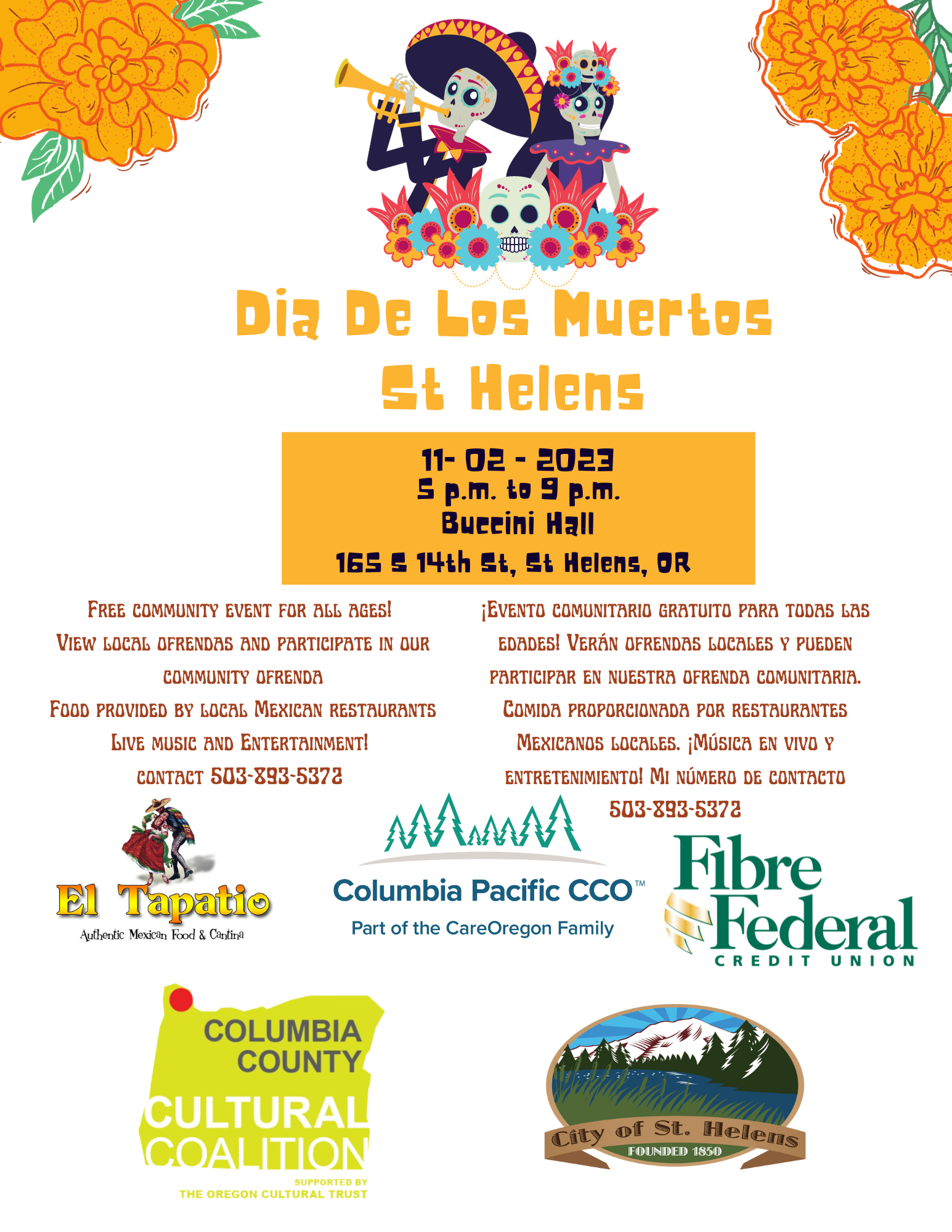 ¡Evento comunitario gratuito para todas las edades! Verán ofrendas locales y pueden participar en nuestra ofrenda comunitaria. Comida proporcionada por restaurantes Mexicanos locales. ¡Música en vivo y entretenimiento! Mi número de contacto (503)893-5372.