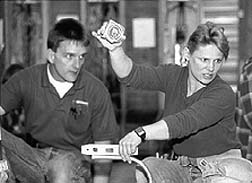 Photo: For 10 years, PCC’s pre-apprenticeship training program has been giving grads a leg up in the building trades. Here, electrician Donna Ainsworth, 1989 B-FIT graduate, teaches first-year apprentice electricians.