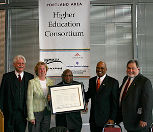 The Memorandum of Understanding (MOU) signed by the presidents officially forms the Portland Area Higher Education Consortium, a mutual pledge of five of Oregon’s largest institutions to integrate student admissions and enrollment, academic planning and support services. The end result will be greater access to courses and degrees for students without having to negotiate multiple systems, and a more efficient and effective delivery of educational programs in the region. Implementation of this initiative is targeted for fall of 2007.