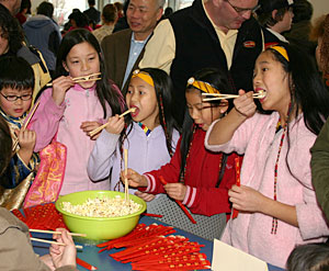 Right photo, the lion dance was one of the main attractions at this year’s event. Bottom photo, local grade school students get a taste of how to use chopsticks at one of the many tables featuring Asian cuisine.