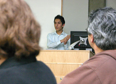 Graphic design major Jose Cruz along with Javier Trinidad (not pictured) discuss strategic plans for Latinos at the library. The presentation was made before the Education Latina Club at the Sylvania Campus. The club’s mission is to promote, communicate, and educate students about Latin America culture. It guides students to the appropriate resources and support for their educational pursuits at the college. Its next meeting is planned for Thursday, April 3, from 2-3:30 p.m. in the library, Room 112. Staff are welcome to attend. For more information, email: mmacias@pcc.edu.