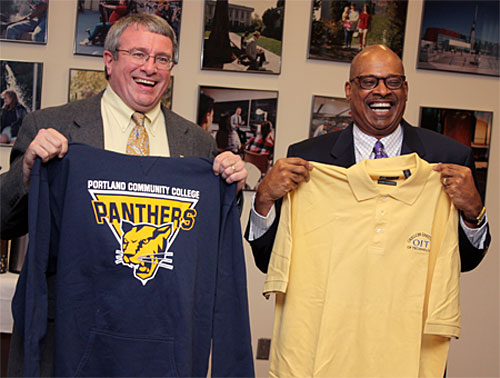Portland Community College and Oregon Institute of Technology signed a dual enrollment agreement on Tuesday, Nov. 18. Chris Maples (left), president of Oregon Institute of Technology, exchanged school-logo shirts with Preston Pulliams, PCC president, in honor of the signing. On Tuesday, the presidents penned the agreement that will help hundreds of students seeking technical careers make the transition from PCC to OIT.