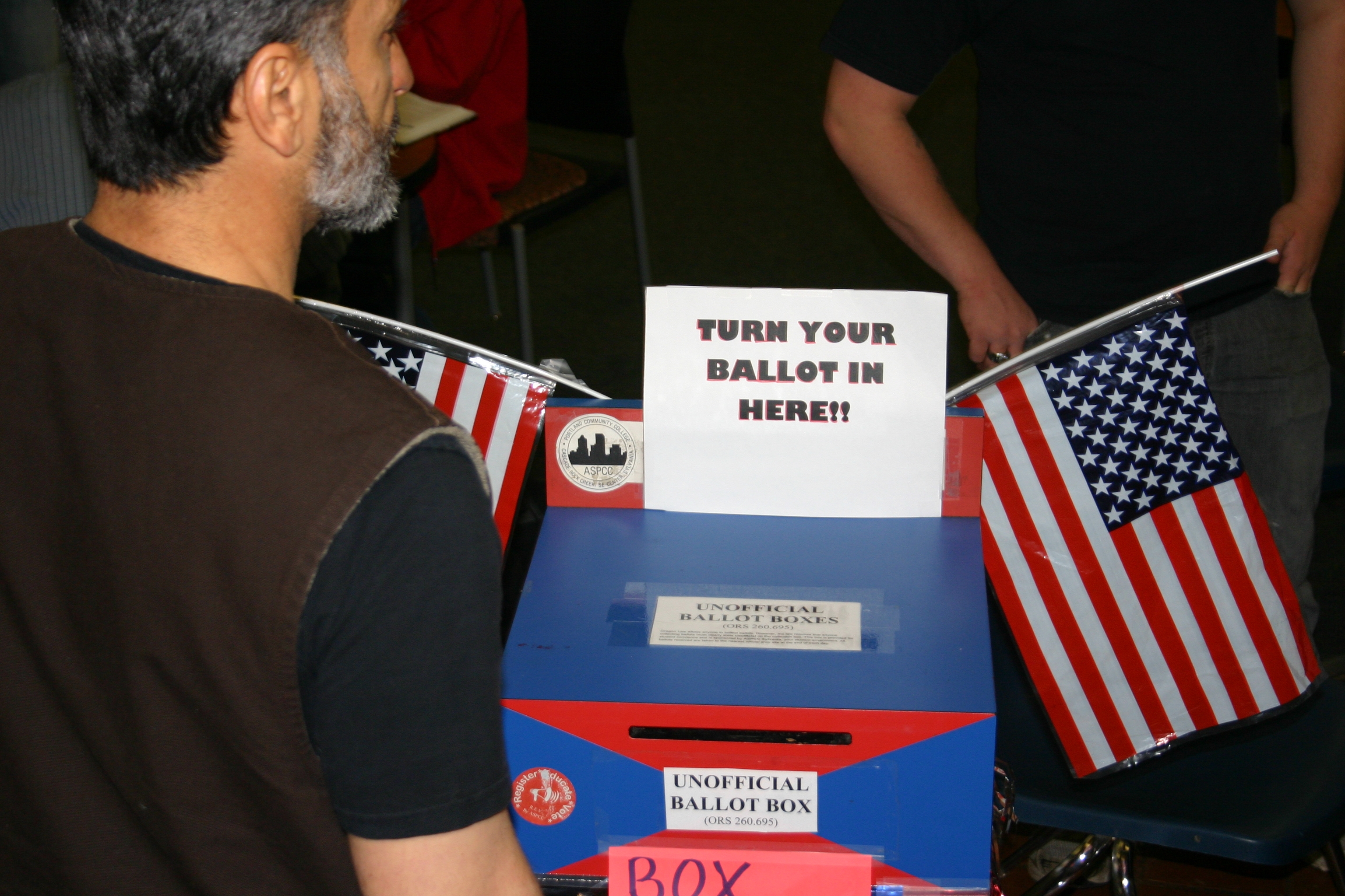 This is why I love election day so much: I step out into the College Center’s main mall and find two volunteers staffing a booth, taking people’s ballots. The ballots then will be dropped off at the Multnomah and Washington county elections divisions before tonight’s 8 o’clock deadline.