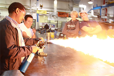Portland Community College students, left to right, Amanuel Ocbaslassie of Northeast Portland and Alfredo Rivera of Hillsboro show off a fuel injection system to a group of on-looking high school students. The two second-year Diesel Service Technician students were assisting their instructors in showing off what their program has to offer future college students. The injection system shows the high school attendees how it fires up within a diesel engine and propels the valves within the cylinders. This hot demonstration was part of the second annual Career and Technical Opportunities Day on Friday, Nov. 7 at PCC’s Rock Creek Campus. More than 500 high school students and 50 of their teachers from Beaverton, Hillsboro, Portland and Tigard participated in the event, which showcases the college program like Veterinary Technology, Aviation Science, Auto Collision Repair, Microelectronics, Welding, Computer Science, and more. The programs put on interactive workshops to help the students see some of the options they have as they head toward high school graduation and college.