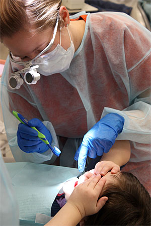 Dental Hygiene student Britney Wolthuis of West Linn prepares to clean a child’s mouth during PCC’s 12th annual Sealant Day. Approximately 54 kids from Gladstone’s John Wetten and Beaverton’s Greenway elementary school took part in the Dental Hygiene program’s event on Friday, Feb. 20 at the dental labs of the Sylvania Campus.