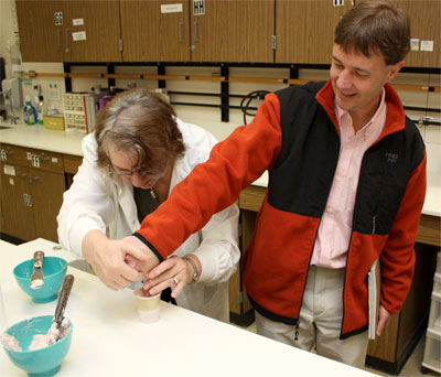 John Wetten Elementary School vice principal Kevin Anderson tries his hand at getting a mold of his thumb. Sealant Day is only one of several service opportunities available to the dental hygiene program students. Second-year students also provide assistance to clinics in the area, teach oral health education in schools and visit long-term care facilities.