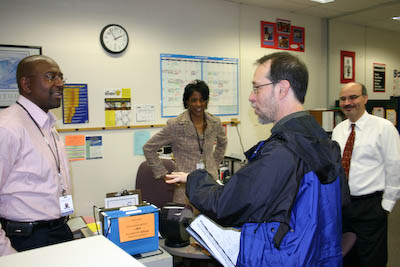 Rep. Michael Dembrow, foreground, gets a debriefing on workforce development issues today, Monday, March 23, from Eddie Lincoln (from left), coordinator of business services; Tracee Wells, employment specialist; and Abdul Majidi, manager of workforce development. Today was an "in-service" day for lawmakers, and all committee meetings were cancelled to allow for workday visits to their districts. (Dana Haynes)