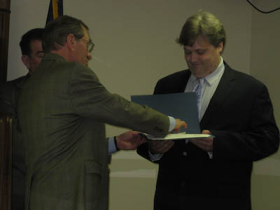 PCC student Aaron Hoyt accepts his Career Readiness Certificate from Gov. Ted Kulongoski. (photo by Dana Haynes)
