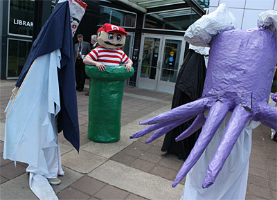 Other students gather around the Sylvania Library to prepare for its invasion. The students, wearing their 3-d artwork, strolled silently through campus commons and buildings.
