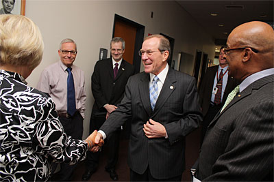 Gov. Kulongoski meets PCC Board Member Marilyn McGlasson just before the governor’s hearing. Also on hand were, left to right, Neal Naigus (assistant to the president and community relations manager), Dana Haynes and PCC President Preston Pulliams.