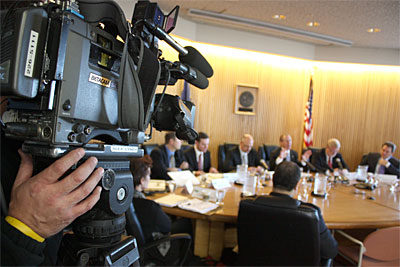Local TV stations also were attendees to this important hearing, held at the Sylvania Campus’ conference rooms. Kulongoski (center) was able to hear a report about how PCC was using its bond money, and possibly some federal money, to retrofit the Sylvania Campus and make it the greenest campus possible.