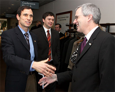 Rep. Larry Galizio (left), also a PCC speech instructor, is greeted by PCC Public Affairs Manager Dana Haynes just before the governor’s arrival. Gov. Ted Kulongoski unveiled a new advisory committee focusing on environmental issues.