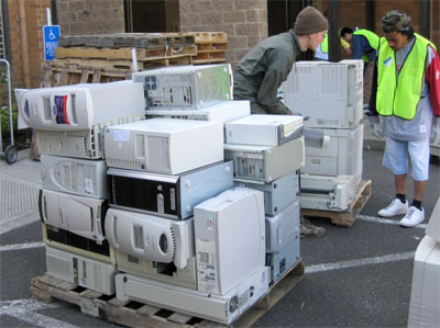 A mountain of old computers, keyboards, monitors, stereos and cell phones took shape on May 9, when the Sylvania Campus hosted a recycling drive for unwanted computer equipment, as part of the annual spring cleanup with Southwest Neighborhoods, Inc., and SOLV Litter Patrol. The half-day event took place at the Portland Christian Center and collected more than 1,000 electronic items, tipping the scale at 7.9 tons were recycled. In addition to computer equipment, the recycling drive accepted scrap metal, couches, large appliances, yard debris and wood.