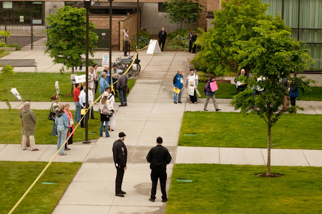 Protesters ring the Moriarty Arts and Humanities Building on Friday, prior to a health insurance reform town hall. (Photo by Russell Banks.)