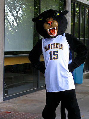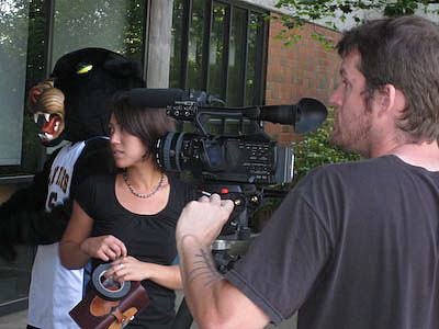 The Panther takes a moment to find his spot while director Rose Leiker and cameraman Kevin Forrest scout the Panther’s next move during his tobacco-free PSA. No feline named Poppe was harmed in the filming of this video.
