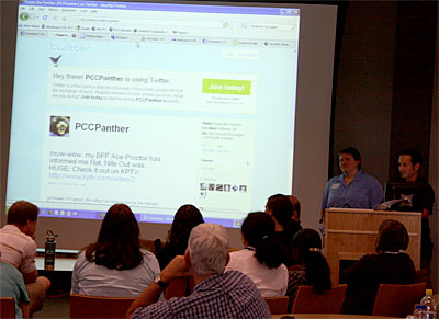 And, during Technology Solutions Services’ retreat last week at the Rock Creek Campus, Poppe’s popular Twitter page was all the buzz among technology staff. Here, PCC Web designer Gabriel McGovern, far right behind podium, shows off Poppe’s latest tweets and the power of using the service to get out information about the college in an entertaining fashion.