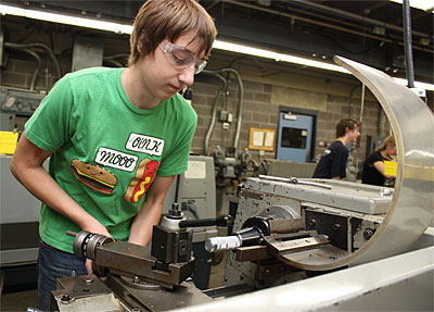Ryan O’Donnell of the 2635 Lake Monsters robotics team works on a lathe to create a hammer handle in the Machine Manufacturing program’s shop at the Sylvania Campus, 12000 S.W. 49th Ave. O’Donnell, a student at Lakeridge High School in Lake Oswego, will use the tool to work on his team’s robots for the upcoming season. The two-week robotics camp (it ended Friday, Aug. 7) attracted 25 students from schools and teams in Beaverton, Portland, Oregon City, Riverdale, Tualatin, Gladstone, Albany and Evergreen in Vancouver, Wash.