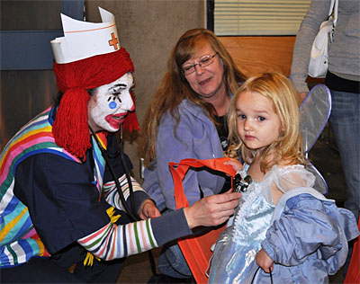 A clown at the fourth annual Haunted Hospital at the Sylvania Campus listens to the heart beat of Hyacinth Stubbs, nearly 3 – the granddaughter of Randy Scovel who works in PCC’s Technology Solutions Services department.
