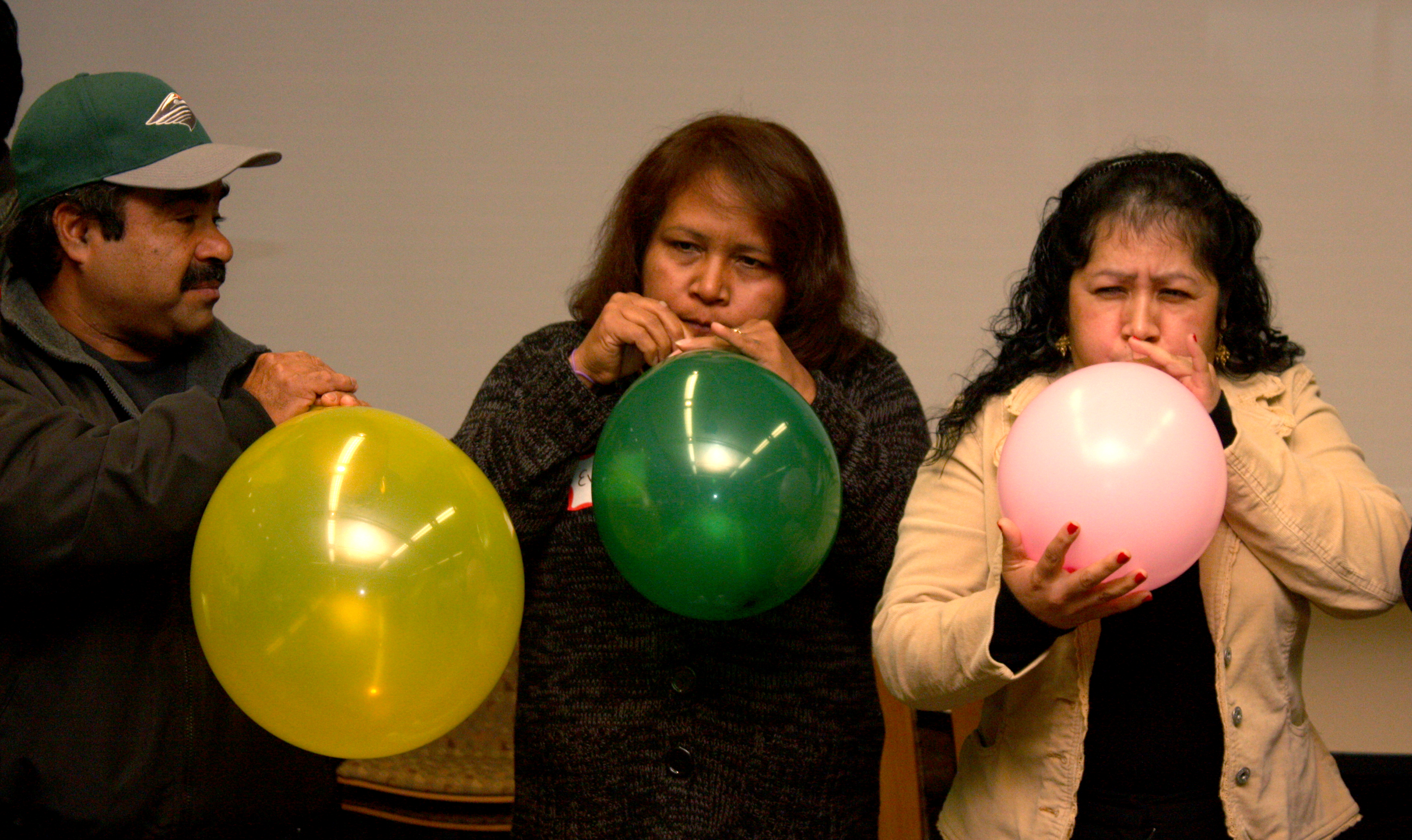 On Nov. 14, local parents of prospective and current College Assistance Migrant Program (CAMP) students blow up balloons as part of an interactive activity to build teamwork at the Rock Creek Campus, 17705 N.W. Springville Road. They then raced with their balloons to see who could burst theirs first, pitting one side of parents against another. CAMP staff organized this fun Parent College Day to help the parents understand what is expected from their children while participating in the CAMP program, providing the parents, many who’ve never gone to college,an opportunity to experience being college students.