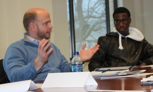 On left, State Senator Chip Shields (North and Northeast Portland) stopped by the Cascade Campus on Wednesday, Jan. 13 to visit with and support Middle College Program staff and students, including John Noel, left, a junior at Jefferson High School. The Middle College program is a partnership between PCC and Portland Public Schools. It allows students from Jefferson and Roosevelt high schools to take college classes – and earn college credit – alongside regular PCC students. And it’s free: the program covers the cost of books, tuition, and fees for its participants.