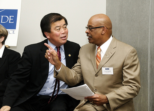 Congressman David Wu, left, discusses business with Preston Pulliams, president of Portland Community College.