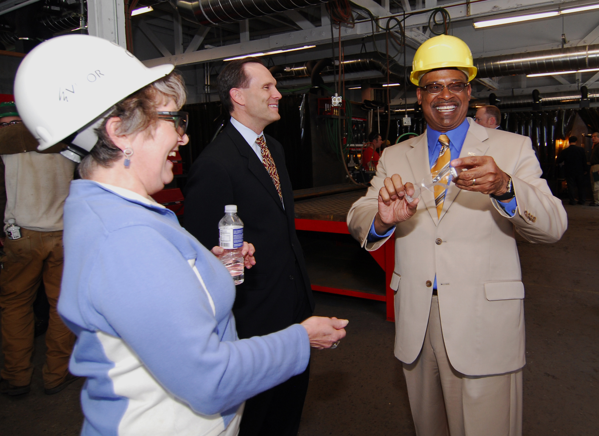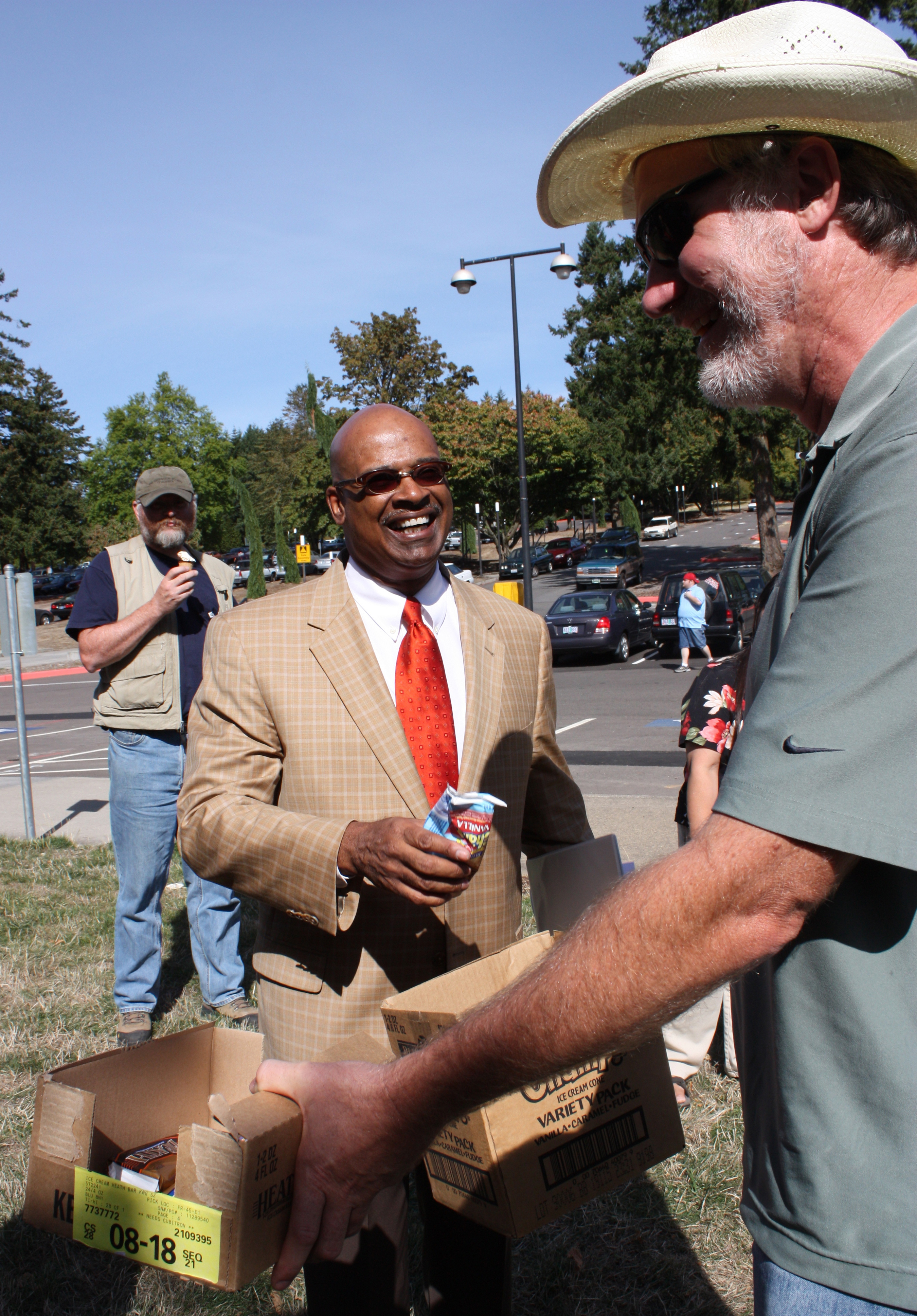 Pulliams enjoys a refreshment offered by former dean John McKee during the Climate Plan signing last summer.