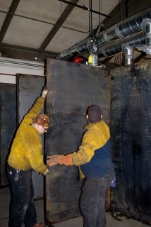 Rob Leavitt (left) and Charlie Osmon, PCC welding students from the Rock Creek Campus, help install pre-fabricated walls for 20 new welding stations at Newberg High School.